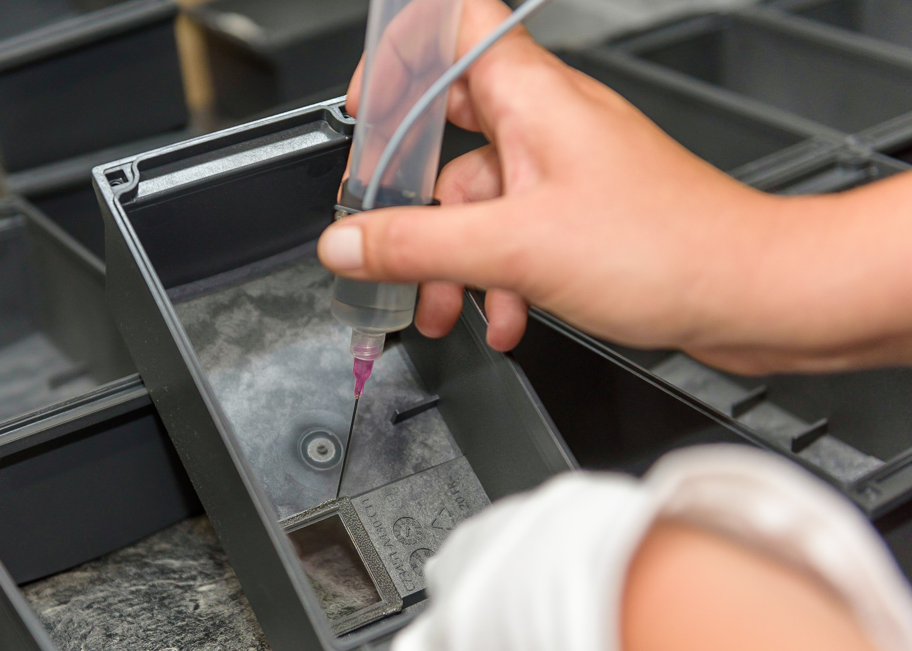 Teileveredelungen wie Tampondruck, Metallisieren (galvanische Beschichtungen) und Lackieren werden durch etablierte, externe Partner durchgeführt